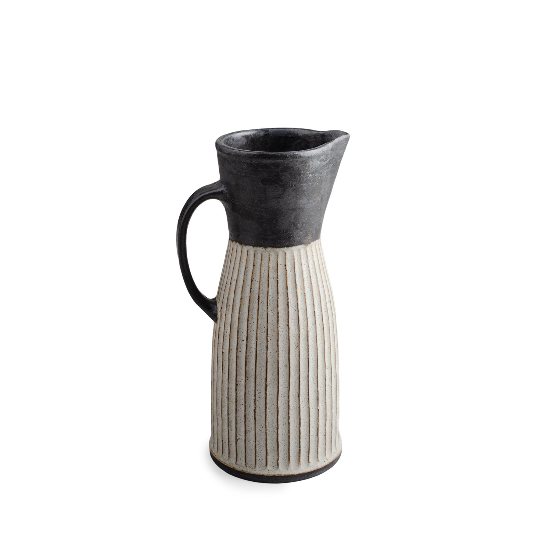 This tall pitcher is a piece of contrasts. The top is decorated in a bold black slip. which is contrasted with Akio's signature white slip below. The body of the pitcher is carved with grooved accentuating its height. The shinogi—a traditional Japanese decorative technique—are carved carefully by hand into the surface of the piece. After bisque firing Akio applies colored slips and then glazes the pieces with translucent matte glaze. Beautiful to see and incredible to hold.