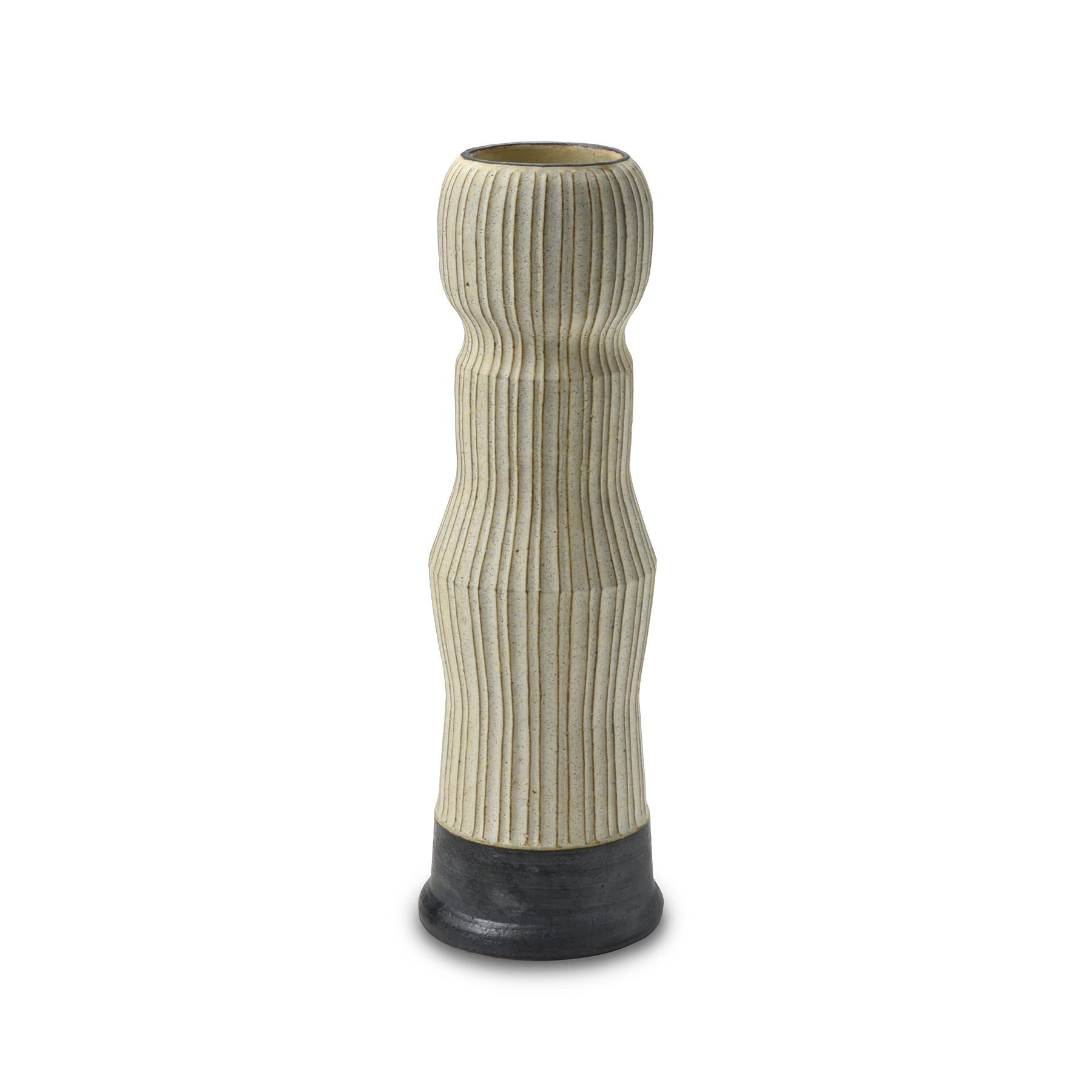 Akio Nukaga's work explores the possibilities of how he leaves a trace of himself in clay. This piece features his signature “Pleated Work” technique of carving grooves into the wet clay after it is thrown on the wheel. The form—inspired by traditional kokeshi dolls—is accentuated by these grooves curving down the profile of the vessel creating movement and rhythm. After the first firing and before the second. he finishes the vessel by applying different colored slips (liquid clay)—a technique that he has refined over the last 30 years. This piece will go on sale as part of Group 2 on Wednesday July 27. 2022. at 12pm PDT.