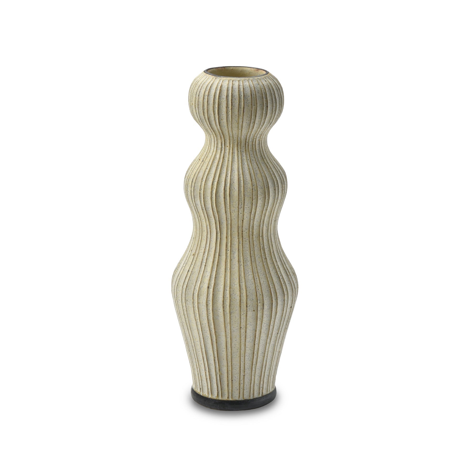 Akio Nukaga's work explores the possibilities of how he leaves a trace of himself in clay. This piece features his signature “Pleated Work” technique of carving grooves into the wet clay after it is thrown on the wheel. The form—inspired by traditional kokeshi dolls—is accentuated by these grooves curving down the profile of the vessel creating movement and rhythm. After the first firing and before the second. he finishes the vessel by applying different colored slips (liquid clay)—a technique that he has refined over the last 30 years. This piece will go on sale as part of Group 1 on Tuesday July 26. 2022. at 9am PDT.