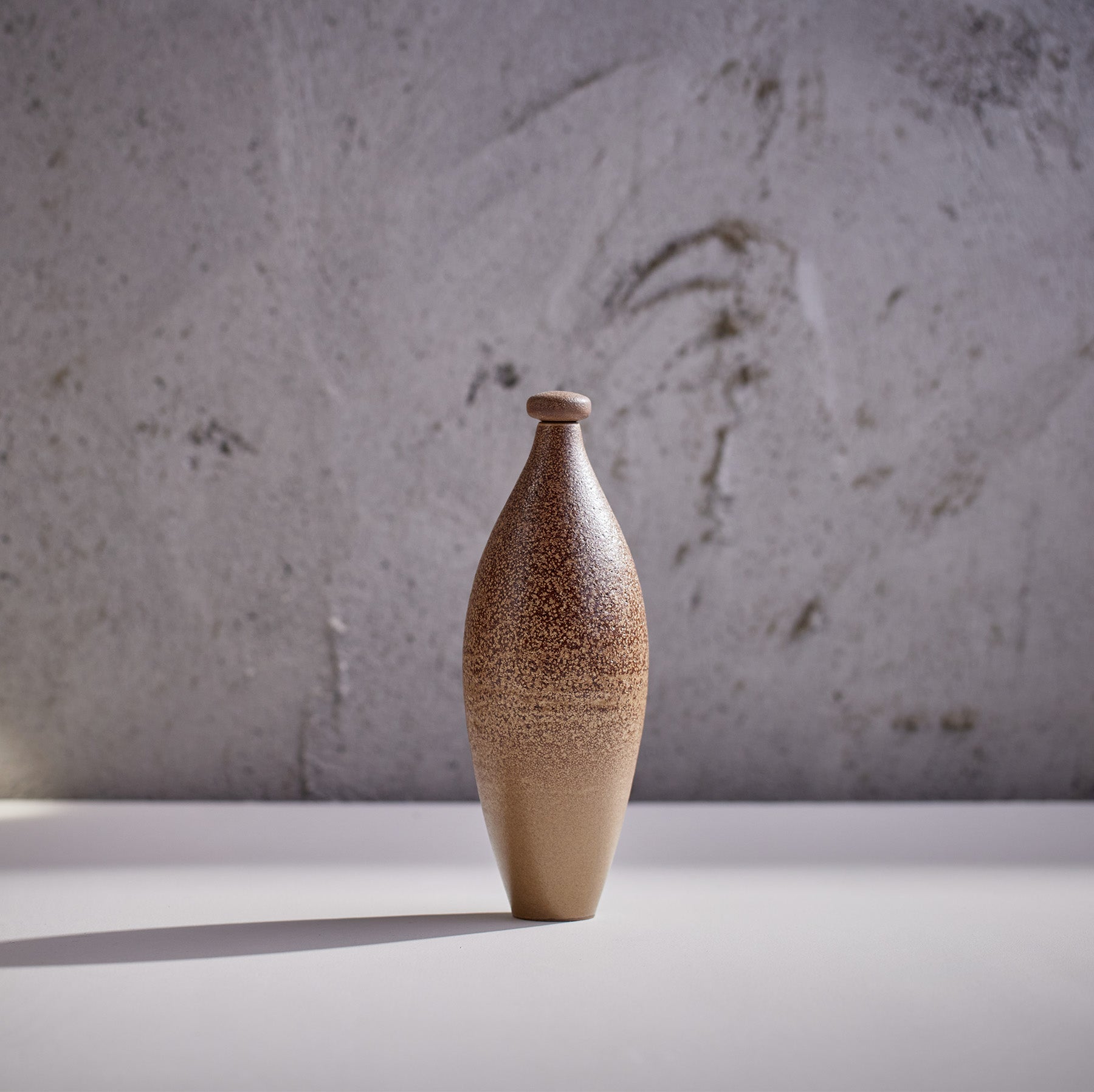 This bottle with stopper is inspired by one of my favorite forms: the olive. It has a rounded body with two pointy ends. —Tung Chiang. Clay Studio Director
