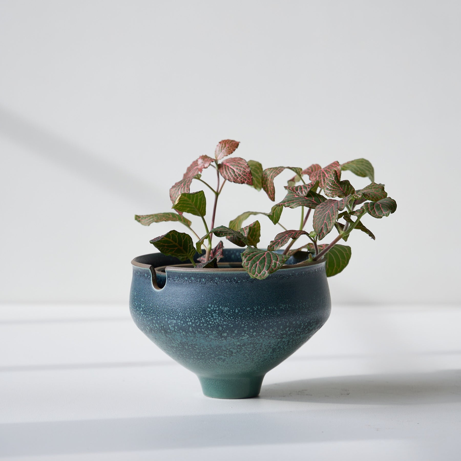 In this nested design. the large exterior saucer envelops the plant pot entirely. A small finger notch in the outer rim allows the interior to lift out easily. The small foot of the saucer elevates its body. which casts a beautiful shadow underneath. Both pieces are glazed to match in two layered shades of green. and paired with a predominantly green leafy plant accented with red veining. — Tung Chiang