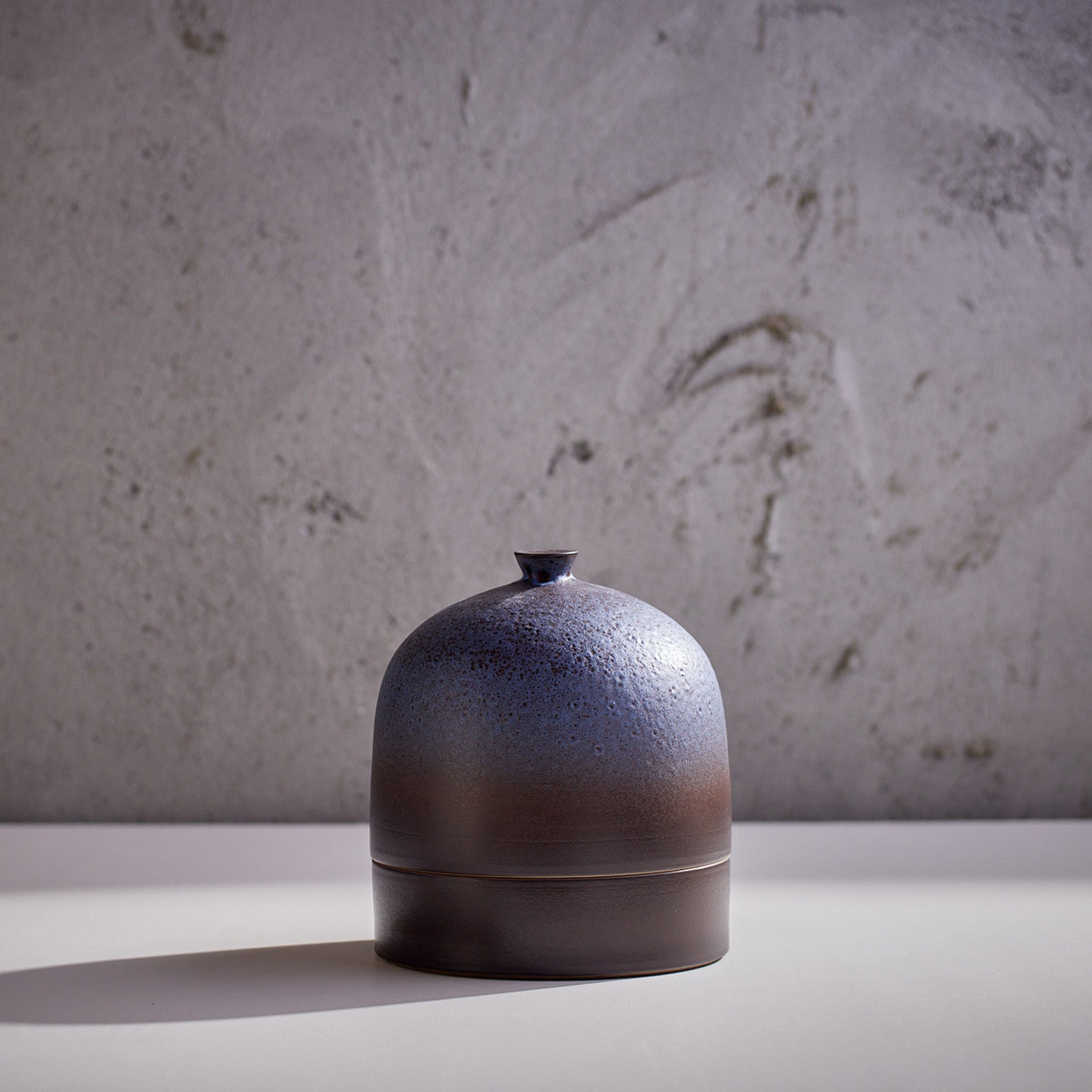 This large dome rests perfectly on a shallow bowl. Inside the piece is glazed with a surprising blue glaze. —Tung Chiang. Clay Studio Director