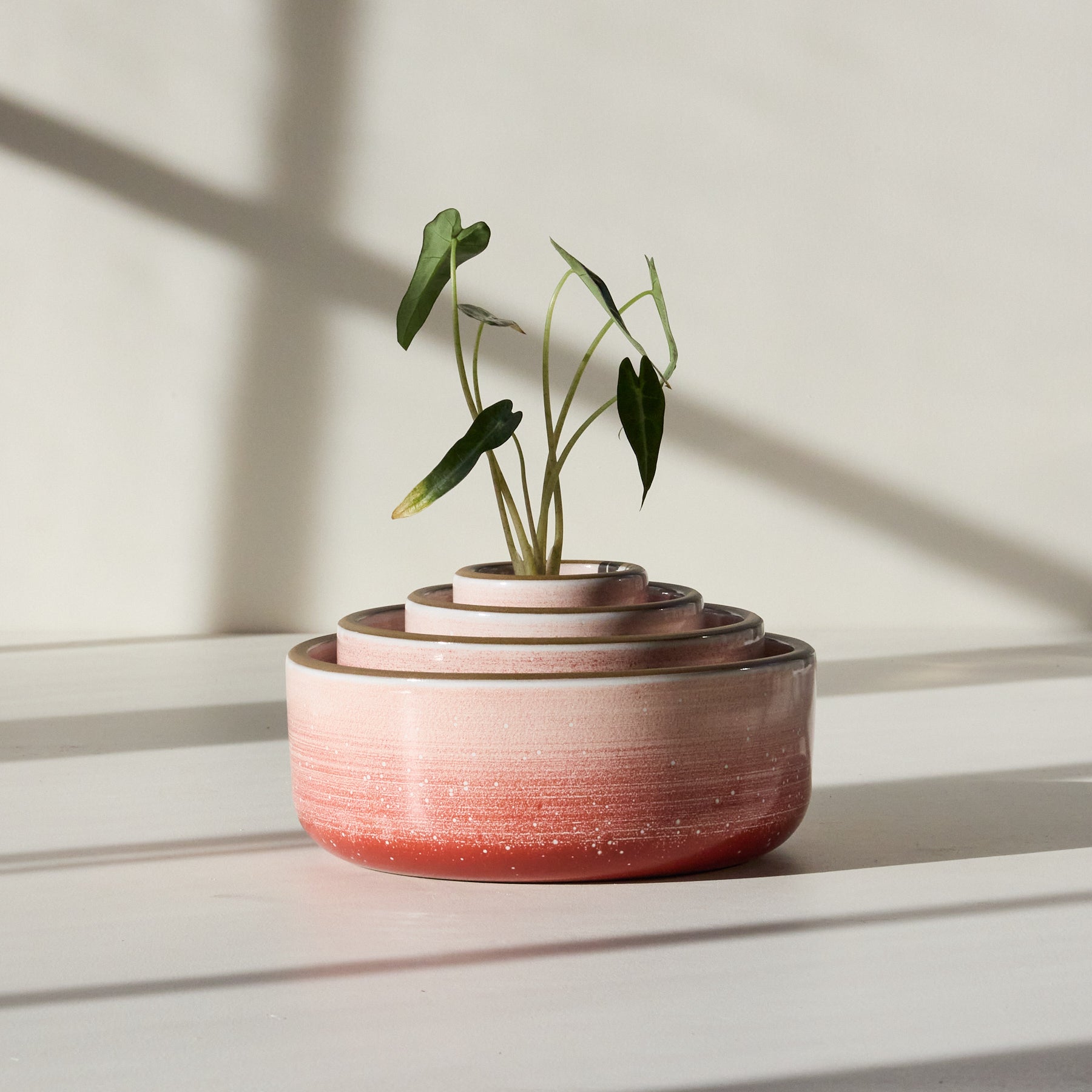 Plants grow. so these nested pots grow. too. The four pieces are all the same height. but when nested. they create a gradual rise toward the center. as each elevates the next smallest one. The largest is a fully enclosed saucer. while the other three have holes for drainage. Use as a single sculptural set. repotting a single plant as it grows over time from one size up to the next or separate them into a loose but harmonious collection. — Tung Chiang