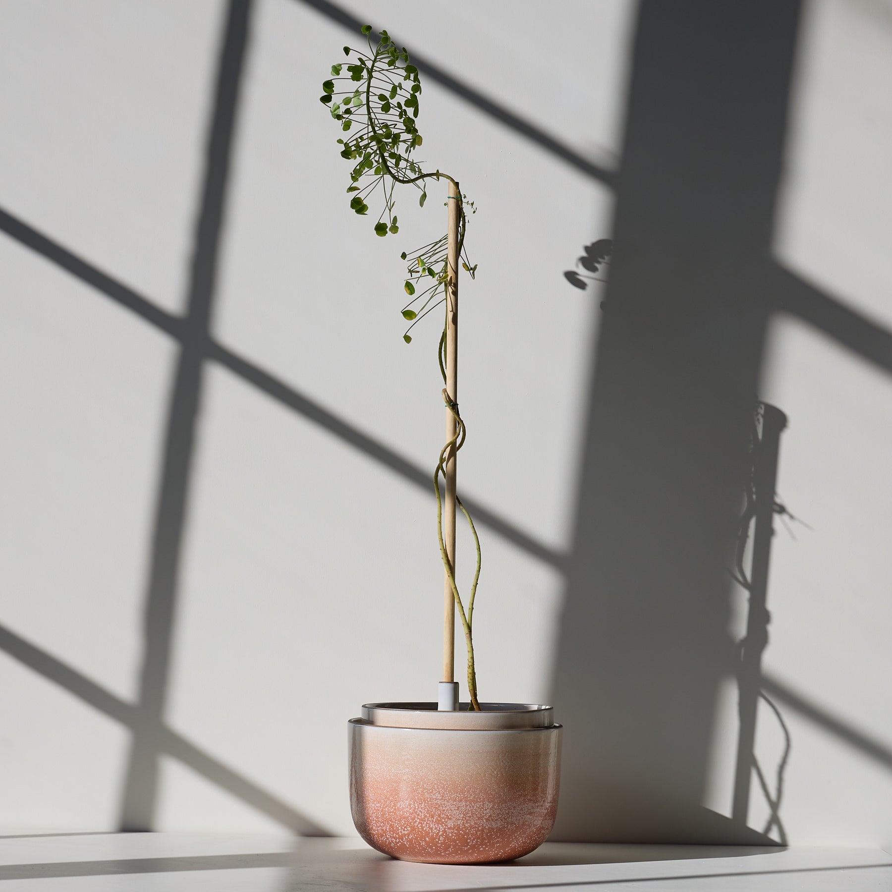 As a plant grows tall. we often stake it with a vertical element to support its growth. In this case. I wanted to design a planter with a dedicated location for a climbing dowel. The small cylinder resembles a chimney within the pot. and the outer bowl acts as the saucer. A glossy terra cotta glaze runs in a gradient. deepening in color at the bottom to emphasize the shadowed curve of the vessel. — Tung Chiang