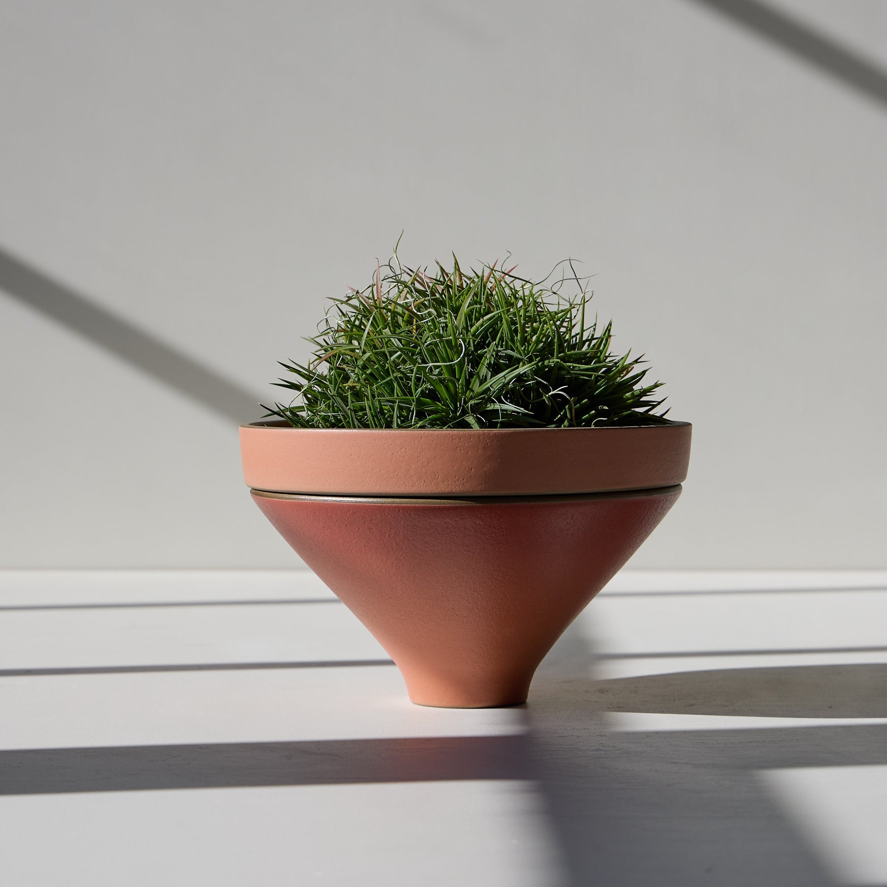 Inspired by our Rim line of dinnerware. with a wide band around the top and a narrow foot. The plant lifts from its base as if floating. Inside the bowl. there is no soil. just a large air plant that grows in a spherical shape. rising out of the cone and filling its circumference. — Tung Chiang