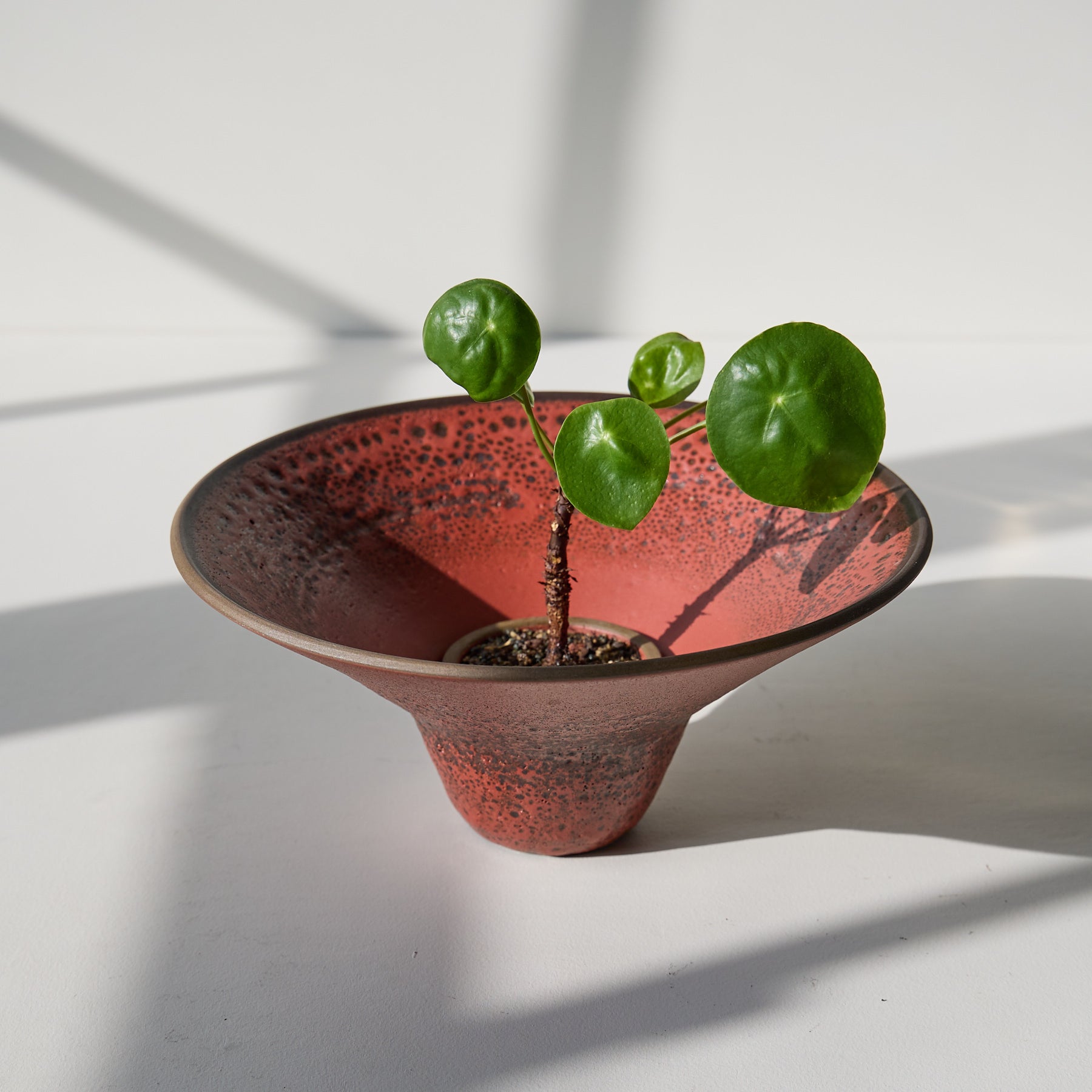 This form is inspired by Ikebana. the Japanese art of flower arranging. which is not just about the vase or just about the flower. but about the space between them as well. Here. a very small. round bowl rests within a large. footed bowl. The sloping interior offers a vast surface that contrasts the color of the plant. The striking glaze comes from a layer of our Terracotta glaze sprayed over Heath Brown glaze. creating unique spotting of brown dots over red. — Tung Chiang