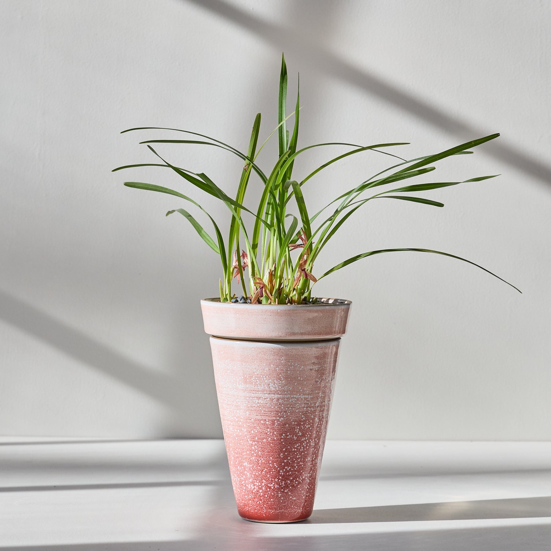Orchids are very elegant. even when they are dormant. As a child. I remember seeing Chinese orchids and admiring their long. slim leaves. even as the focus tends to be on their spectacular flowers. For this form. I chose a cone shape that would echo the fanning of the leaves. with a shorter interior bowl that lifts the plant from within. raising it higher above the table. The exterior. brightly glazed cone could also be used for flowers. — Tung Chiang