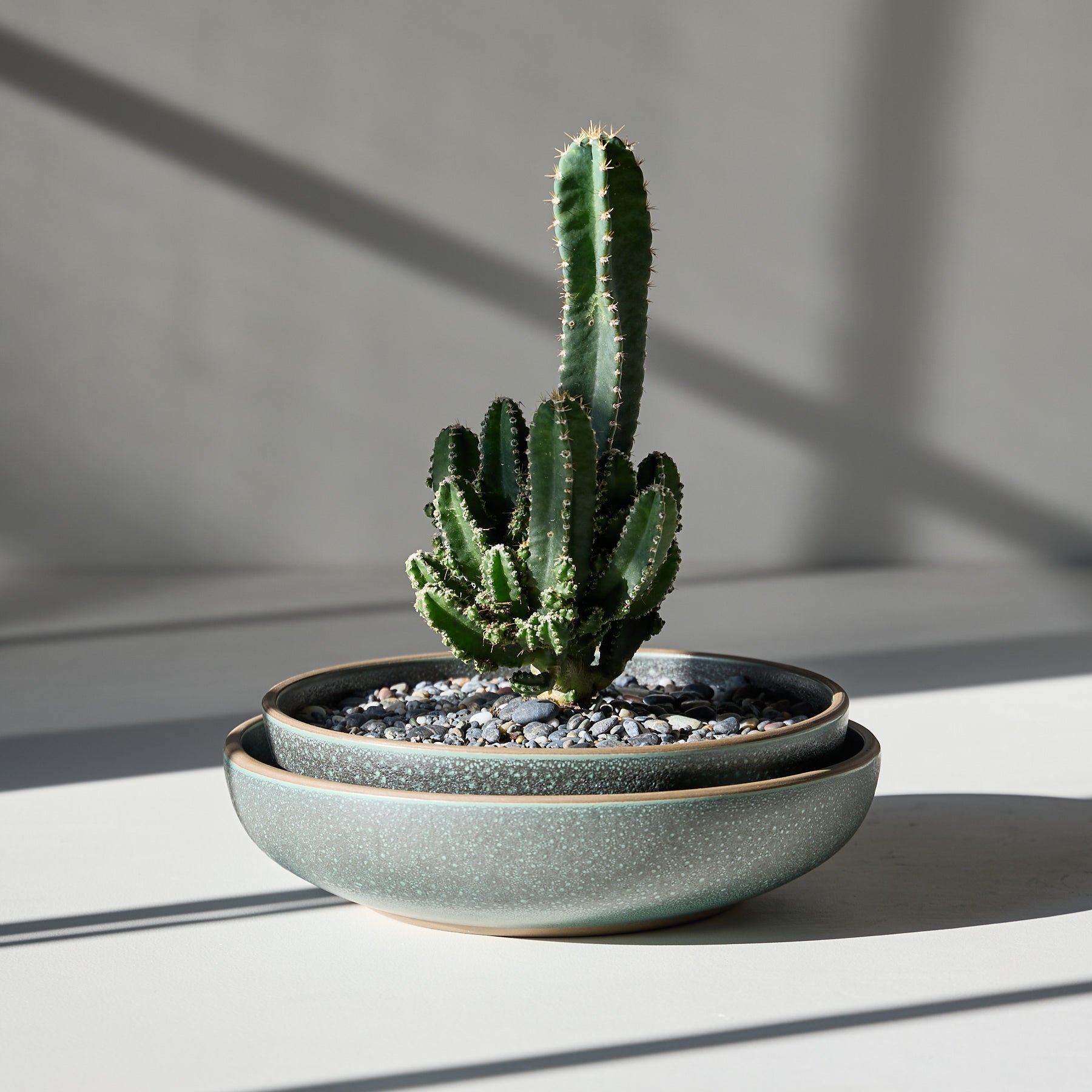 I love the low profile on traditional bonsai planters. which bring the root as close to the ground as possible. These two shallow bowls nest within each other. with a pair of interior holes that can be used to secure the root. The extended edge on the inner planter makes it easy to lift and remove when it's time to release water from the saucer. — Tung Chiang