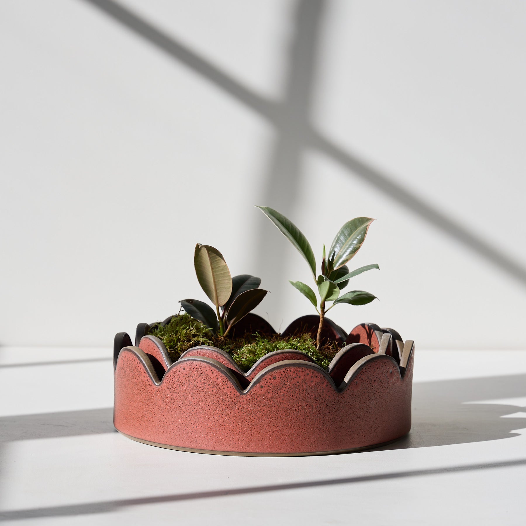 This form is like a tiny garden unto itself. It reminds me of my neighbor. a home gardener who loves and cares for her plants. The scalloped edge on this design is used twice. on both the inner and outer pots. with an unglazed edge similar to classic Heath dinnerware. which showcases our special clay. — Tung Chiang