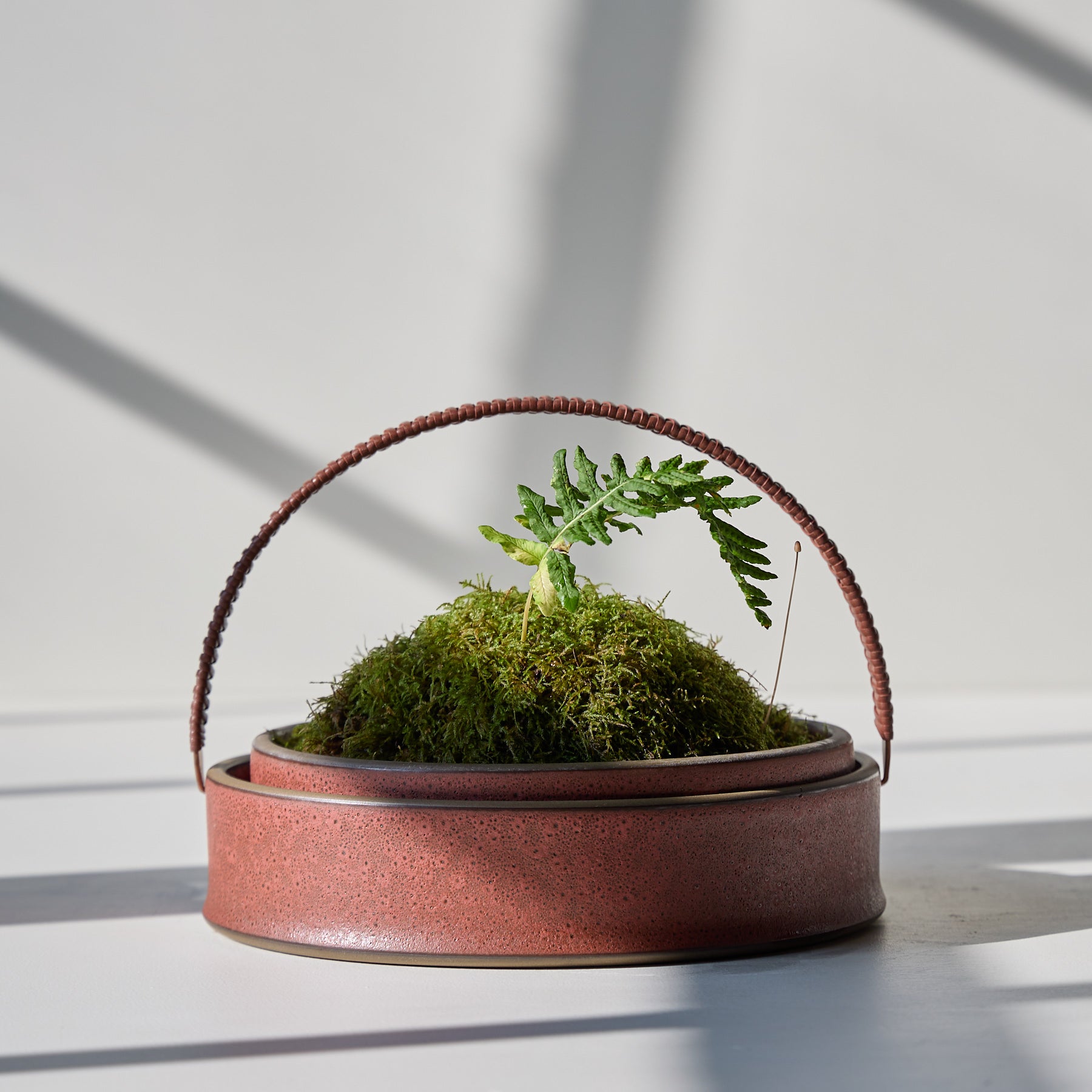 This piece is inspired by the original teapot designed by Edith Heath. which had a bent brass handle wrapped in woven leather. A planter is not necessarily a stable element in your home. so the handle speaks to mobility. like a basket for transporting plants. In this form. the inner bowl contains a moss garden accented with a fern. which arcs beneath the curved handle. The rim of the saucer. followed by the planter and then the domed garden come together to mimic a natural hillside. — Tung Chiang