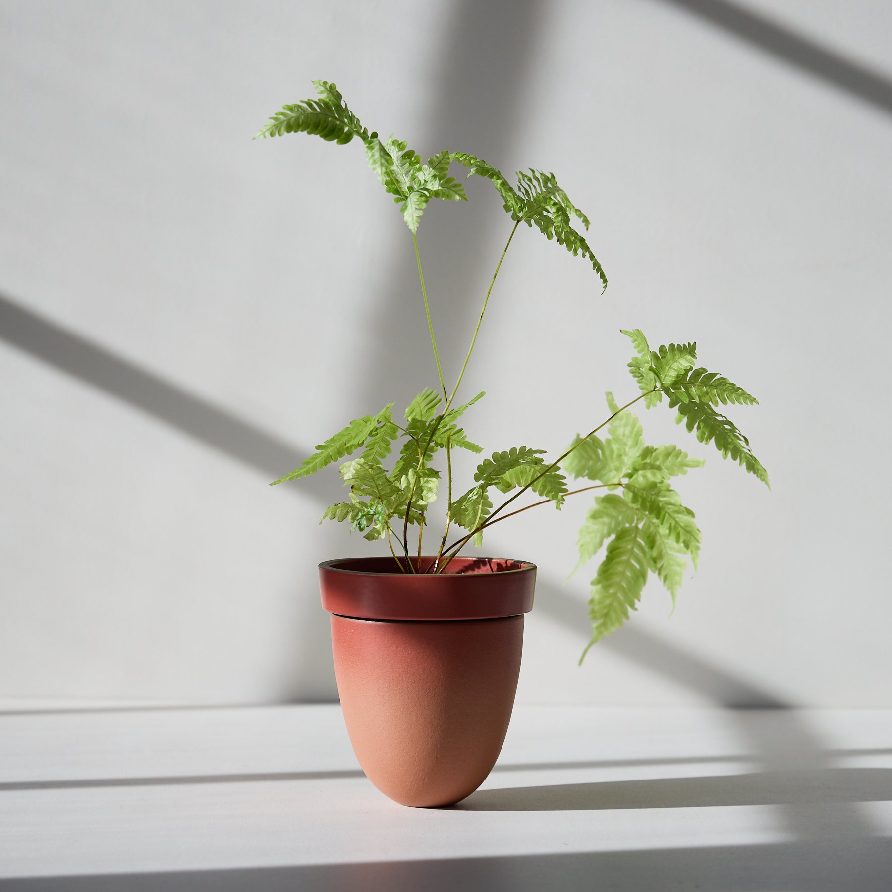 This form is a simple memory of a classic terracotta pot. The inner vessel has a conical shape and wide rim. with a rich red glaze that is partially hidden within the saucer. visible only as a wide rim above the outer form. whose glaze has more variation and shine from a gradient of orange hues and light. warm speckles. — Tung Chiang