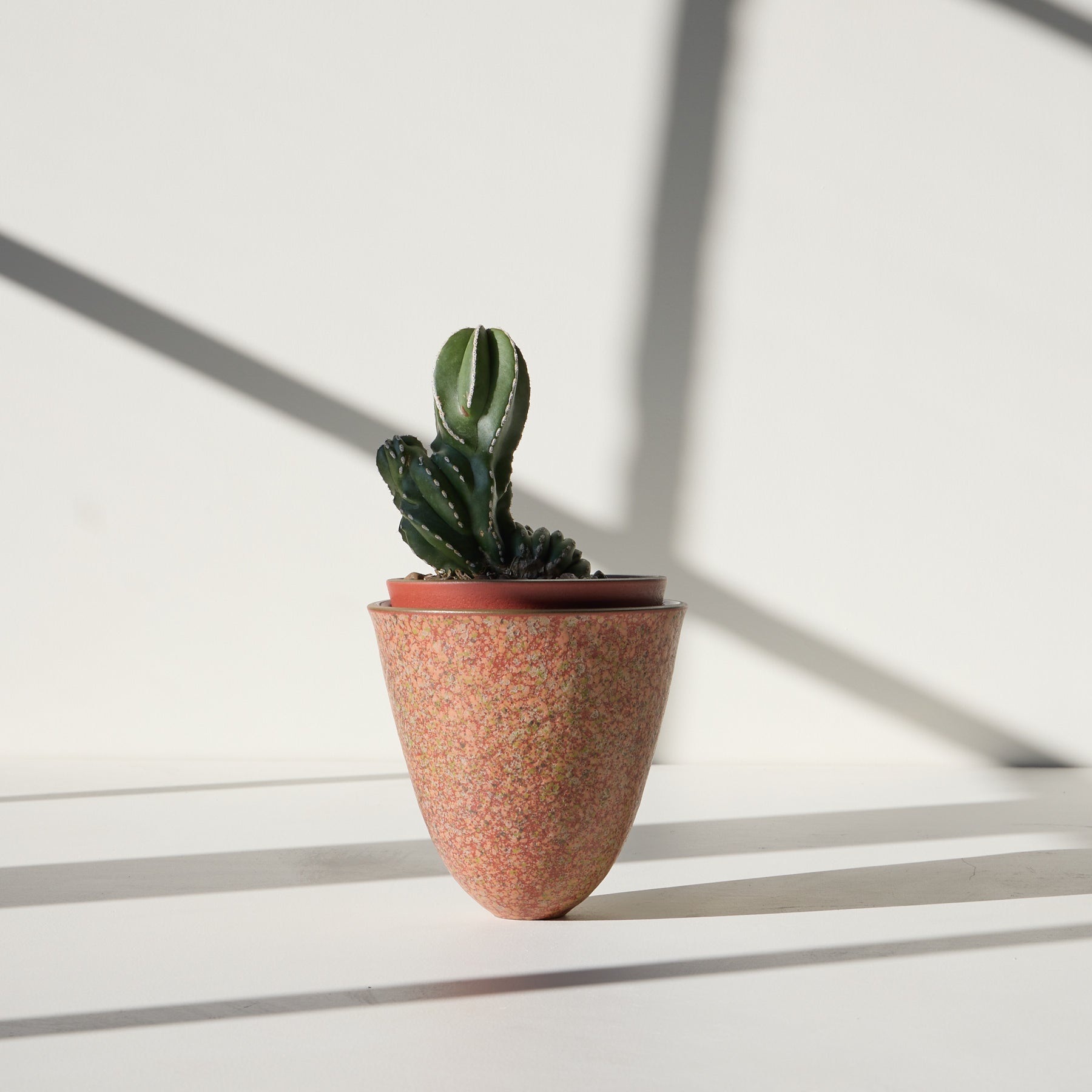 This design celebrates plants without a flowering element. by taking the form of a blossom itself. The two nesting vessels look. in profile. like a trumpet flower. with the inner stamen emerging beyond the edge of the outer petals. The glaze is very rich and textured from the outside. with a plain one on the inside. The plant rests on the simpler portion. while the texture of the outside becomes complementary to the texture of the plant. — Tung Chiang