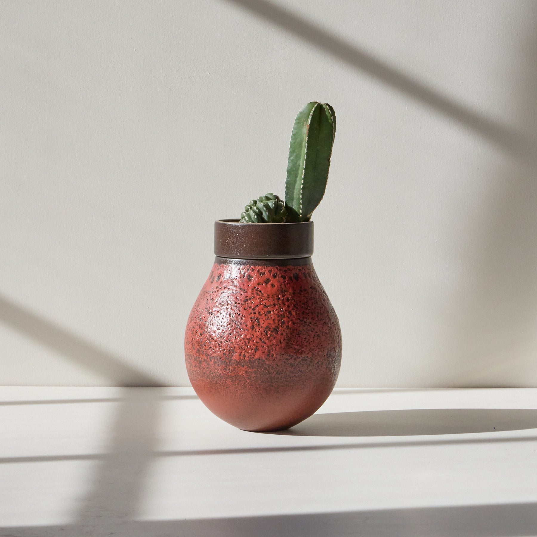 Inside the round-bodied exterior vase. the plant pot within is slightly tapered. with a wide rim. I wanted to give the roots of the plant equal room from top to bottom so they wouldn't be trapped in a tight space as they grow. The inner pot drains into the exterior vessel. which can also be used as a vase. — Tung Chiang