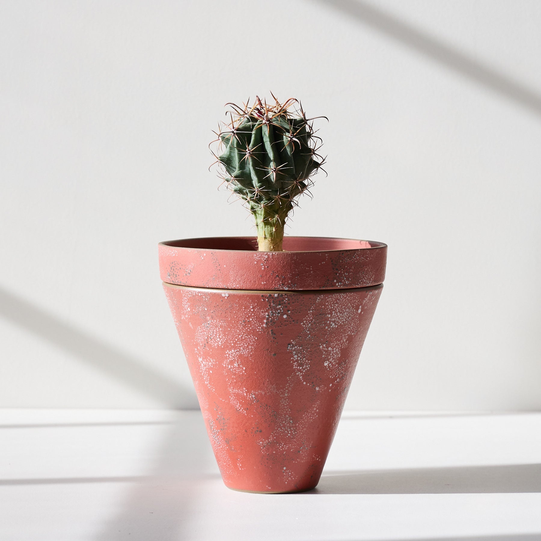 This form is a simple interpretation of a classic terracotta pot. The inner vessel has a conical shape and wide rim. with a rich red glaze that is partially hidden within the saucer. visible only as a wide rim above the outer form. whose glaze is textured and roughened by dots of white and green glaze that mirror the variation of the plant. — Tung Chiang