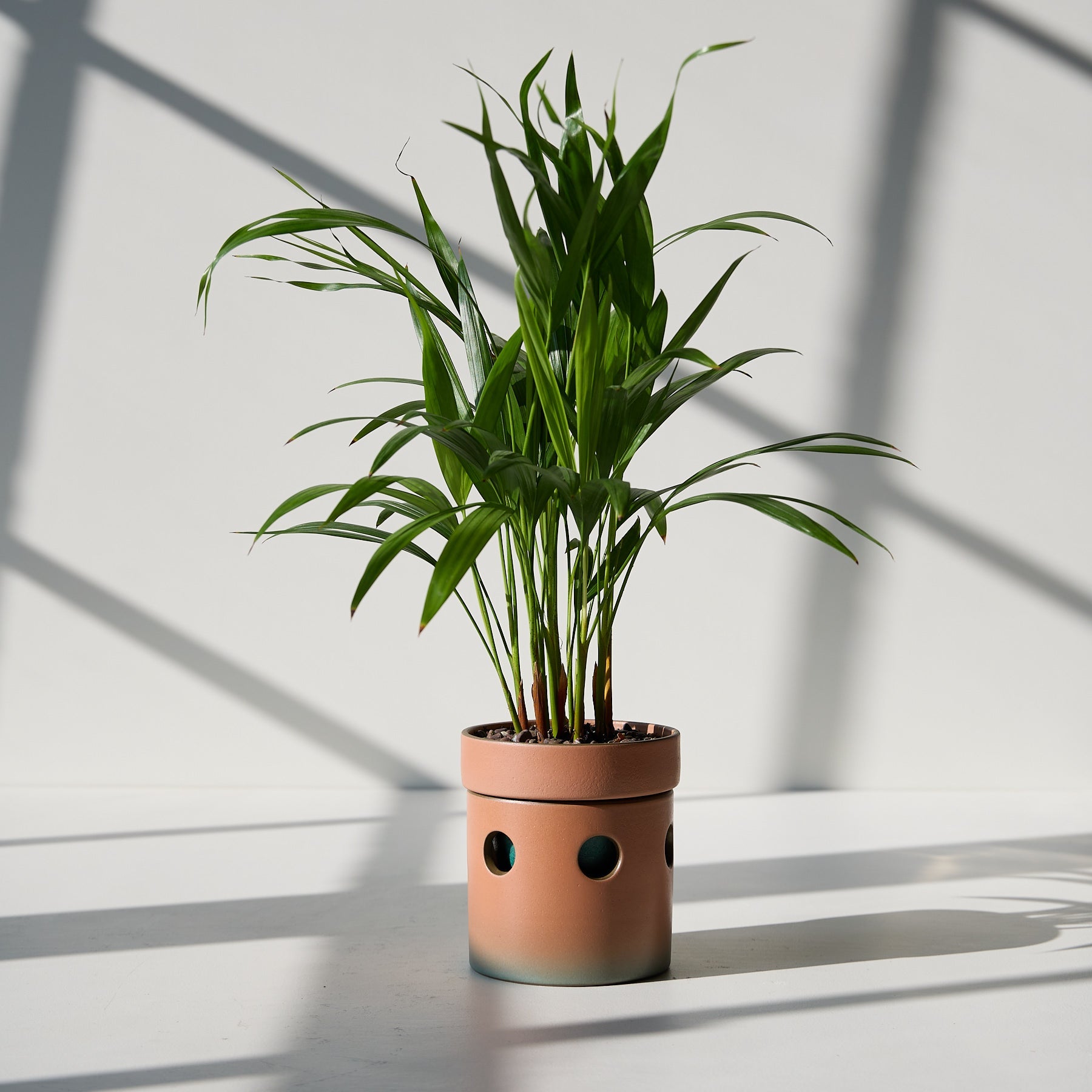 While caring for plants. I have noticed that it's good to let the water that collects in a saucer have room to evaporate so that it doesn't become stagnant. I put seven holes into the walls of the saucer. which not only facilitate evaporation. but also offer a view into the interior piece—a simple flower pot design glazed in a beautiful green that represents the vitality of the plant within. — Tung Chiang