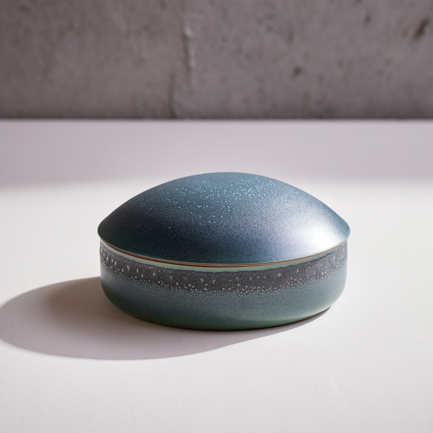 Instead of a handle for this piece. the lid is oversized and hangs over the edge. Open the piece from the edge and review what you've prepared inside. The low dome shape is inspired by an old farm house in Scandinavia. —Tung Chiang. Clay Studio Director