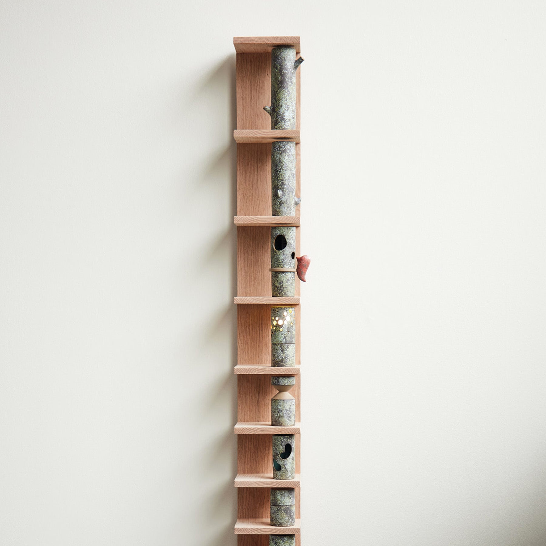 This tall ceramic branch is cut into nine sections each representing a theme from past Design Series and displayed vertically in a red oak shelf. There is a little red bird that is free to fly around and rest on any section of the branch. A simple mechanism allows the bird to stay where she likes. I particularly like when she rests on the piece respresenting Design Series Eight which is shaped like a branch that has been carved by a woodpecker; or when the bird is looking inside the piece representing Design Series Nine which is a planter. The shelf was built by Eddie Aya. an up-and-coming woodworker in the Bay Area. —Tung Chiang. Clay Studio Director