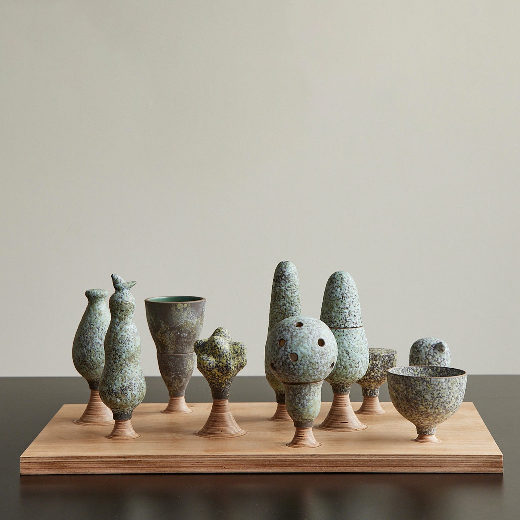 We now know that trees are connected not only in their roots but fungi also help them to share knowledge and information. Each piece represents a theme from past Design Series and are connected with the wooden base letting them share their root and knowledge. The assortment of pieces can be arranged in endless configurations. The wooden base is made from high quality plywood and crafted by my friend Maz. —Tung Chiang. Clay Studio Director