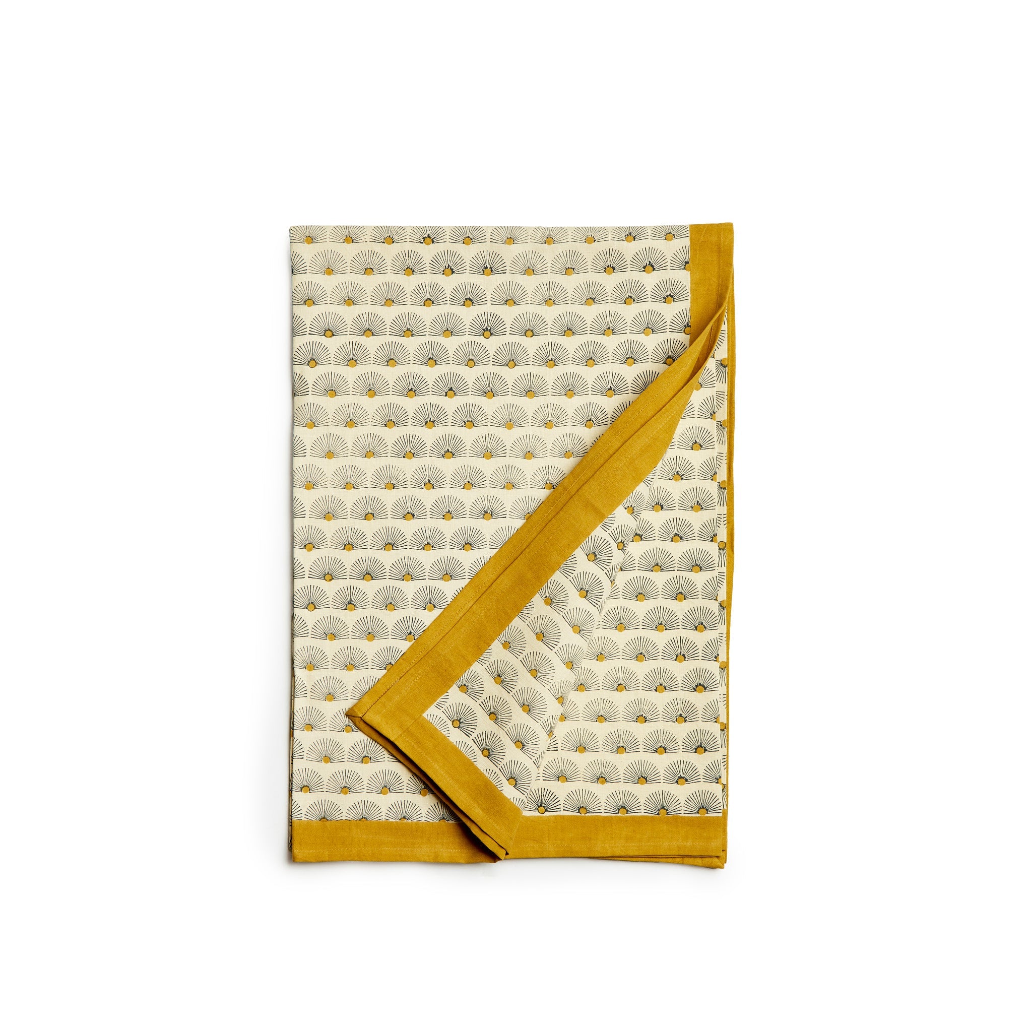 Add elegant charm to your table with this tablecloth printed with a peacock-inspired pattern in warm. golden tones. All Block Shop textiles are made manually: designed on paper. printed with wooden blocks. and dyed in small batches.
