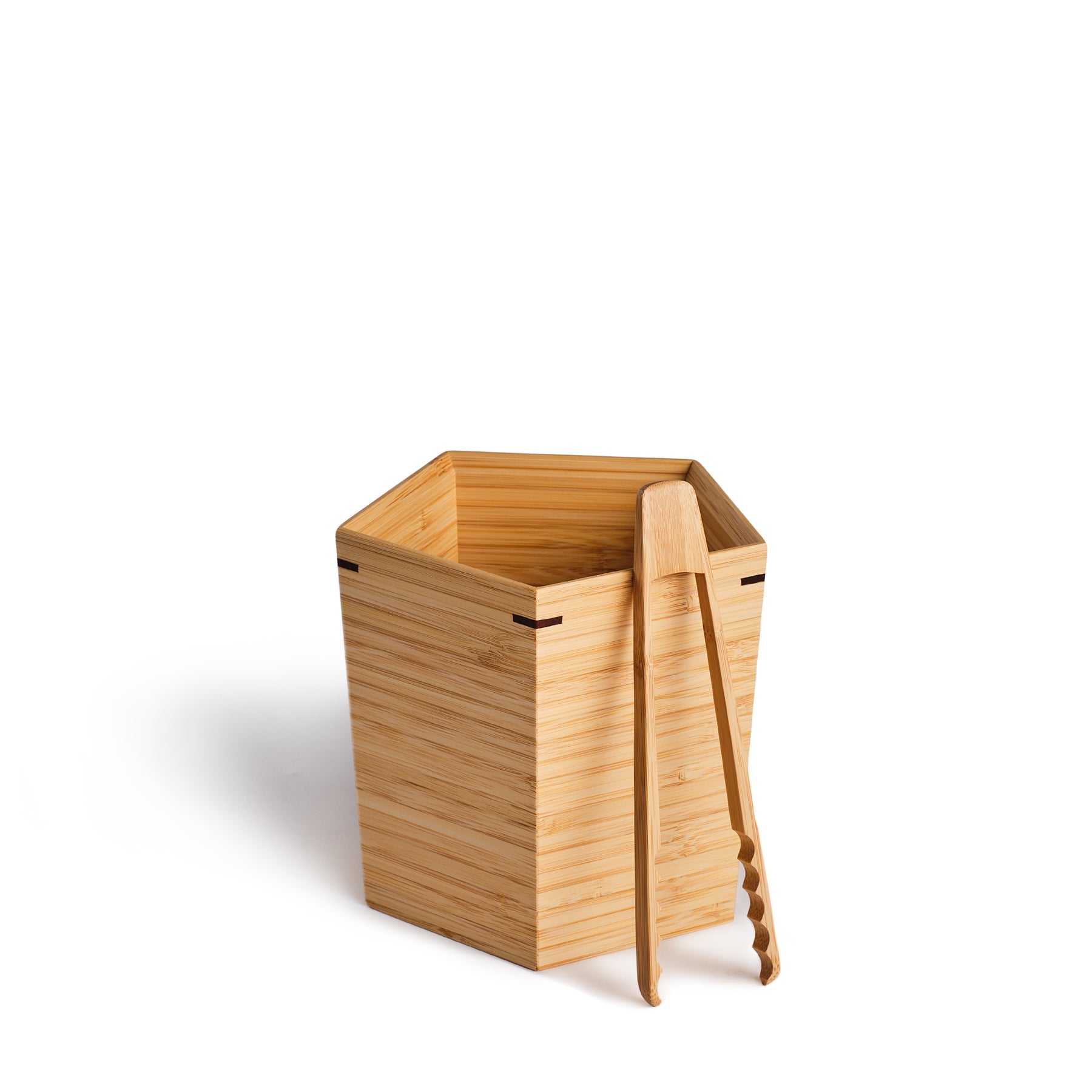 This ice bucket is the perfect complement to an evening of drinks at home or at your next picnic. It's made from laminated bamboo. which has a low thermal conductivity which helps to insulate the ice in the bucket helping it to melt more slowly. The surface is finished in urethanr making it moisture and oil resistant and easy to clean. The corners are reinforced with chigari made of teak which add strength and a contrasting decorative element. Each is made in Japan by fifth-generation craftspeople with bamboo from Kyoto. Includes a set of tongs.