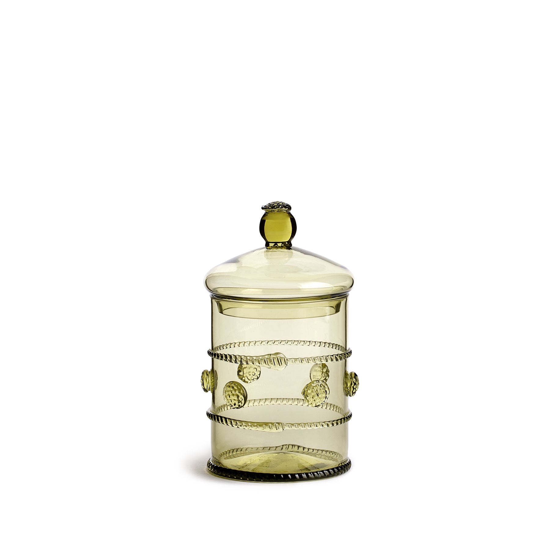 This charming container is the perfect place to store more than just your favorite treats. Each is adorned with decorative pieces of glass called prunts which are shaped and added while the glass is still molten. The design is an homage to green Renaissance-era glassware and makes for a timeless addition to any home.