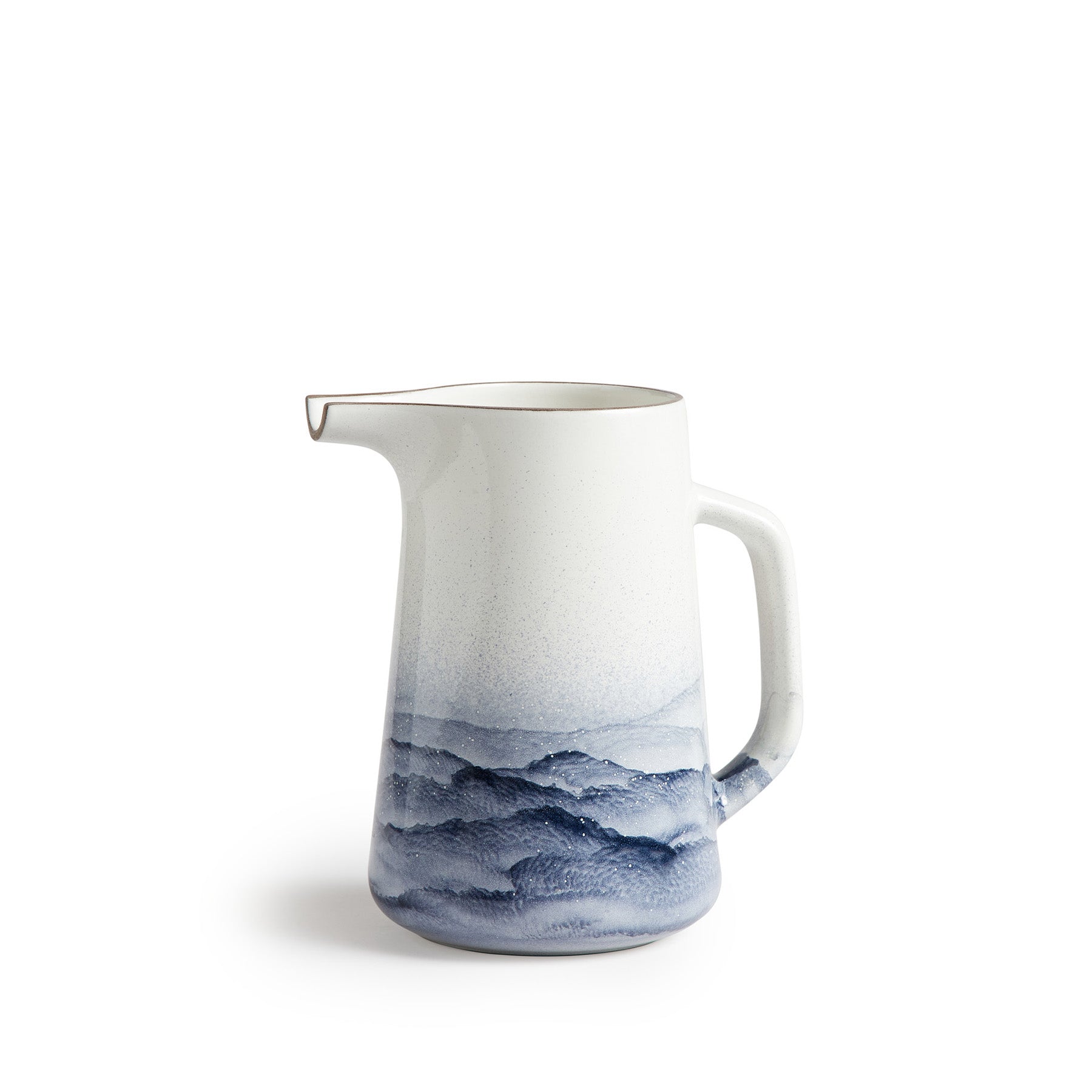 Whether serving water or displaying flowers. the Large Pitcher makes a beautiful addition to any table. The pitcher features Heath's signature wiped edge. which extends across its charming half-moon spout. Here it is glazed in the Watercolor technique—a new and dramatic glaze combination exclusive to Heath Clay Studio pieces. Glazes are applied and manipulated by hand to create a surface that resembles inky landscape paintings. Layered in every sense. each vessel's glaze pattern is unique. Originally created as a one of a kind design as part of the Design Series 2. the Large Pitcher is slip cast in small batches by the Heath Clay Studio team in San Francisco. CA.