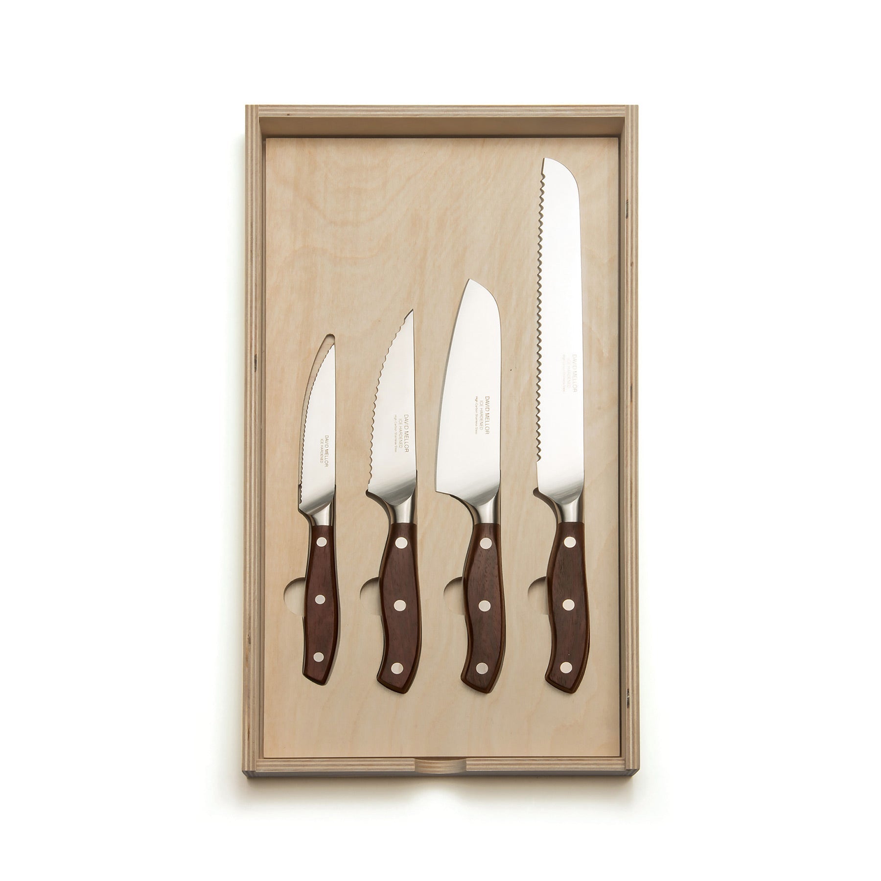 Renowned cutlery maker David Mellor's collection of rosewood knives are made from martensitic steel and feature sustainably sourced Indian rosewood handles. beloved for rich color variance. Carefully hand finished and wonderful to use. This set includes a serrated paring knife. a serrated vegetable knife. a chopping knife. and a serrated bread knife. Comes in a specially designed birch plywood box.