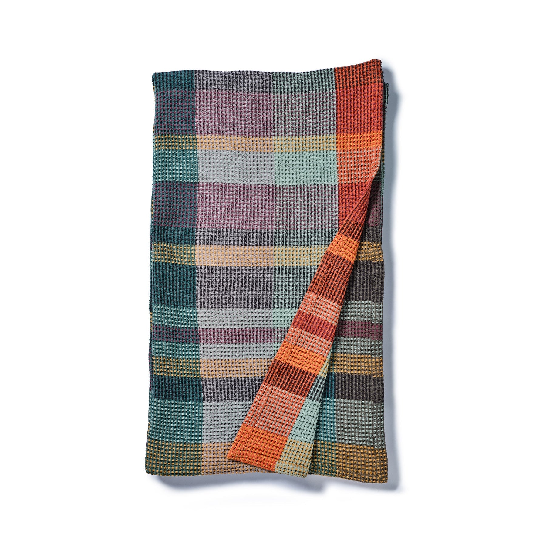 The classic waffle weave has a cellular structure which gives the Vrou-Vrou a chunky body and texture. The pure cotton yarn ensures that it remains light and breathable. perfect for year round luxury. This queen sized blanket is made to cover a bed. but it's also great for an evening stroll or marking your spot by the lake. Each Vrou-Vrou is woven with 9 different coloured yarns into a plaid check design by Lenore Schroeder.
